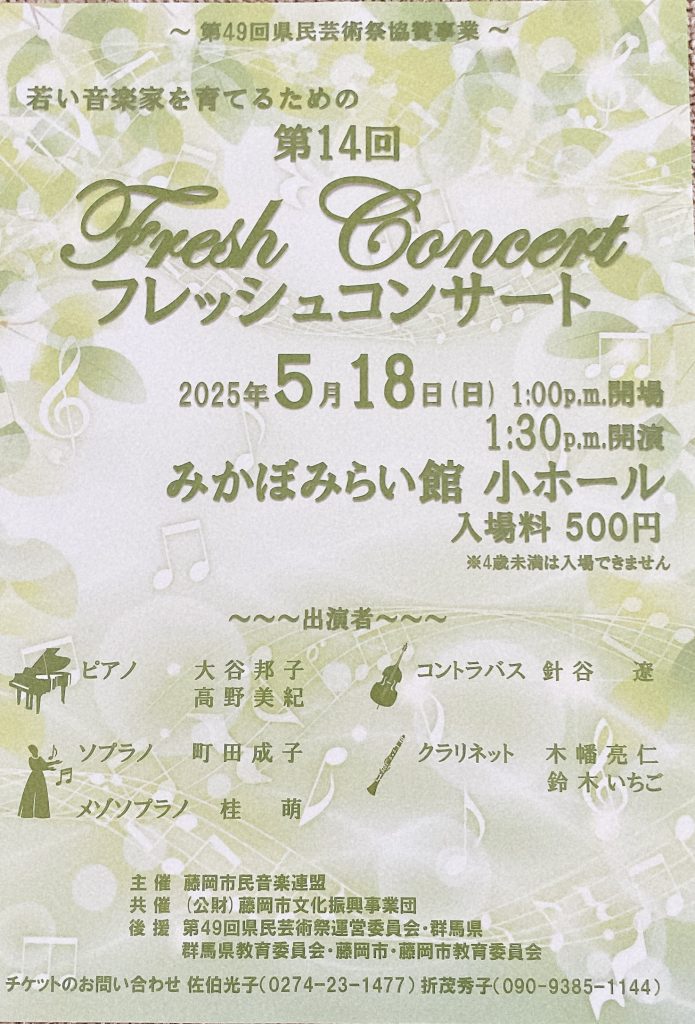 2025年4月14日 / 最終更新日時 : 2025年4月14日 mikitakano-piano コンサートのお知らせ 第14回若い音楽家を育てるためのフレッシュコンサートに出演します 2025年5月18日(日)13:00開場 13:30開演 入場料500円 もはやフレッシュという年齢ではないのですが、お話をいただき、出演させてさただくことになりました。藤岡市民音楽連盟様には、大変お世話になります。 お時間のある方、足をお運びくださると幸いです。 \ 最新情報をチェック / FacebookXBlueskyHatenaCopy
